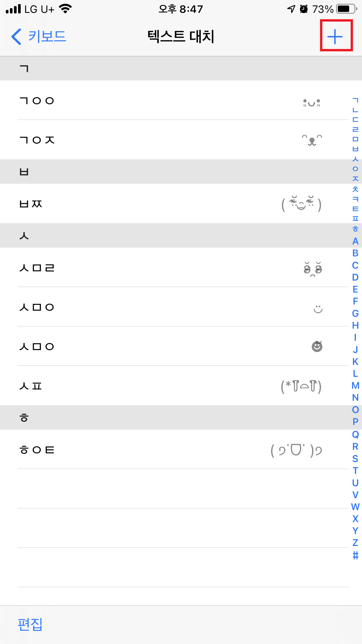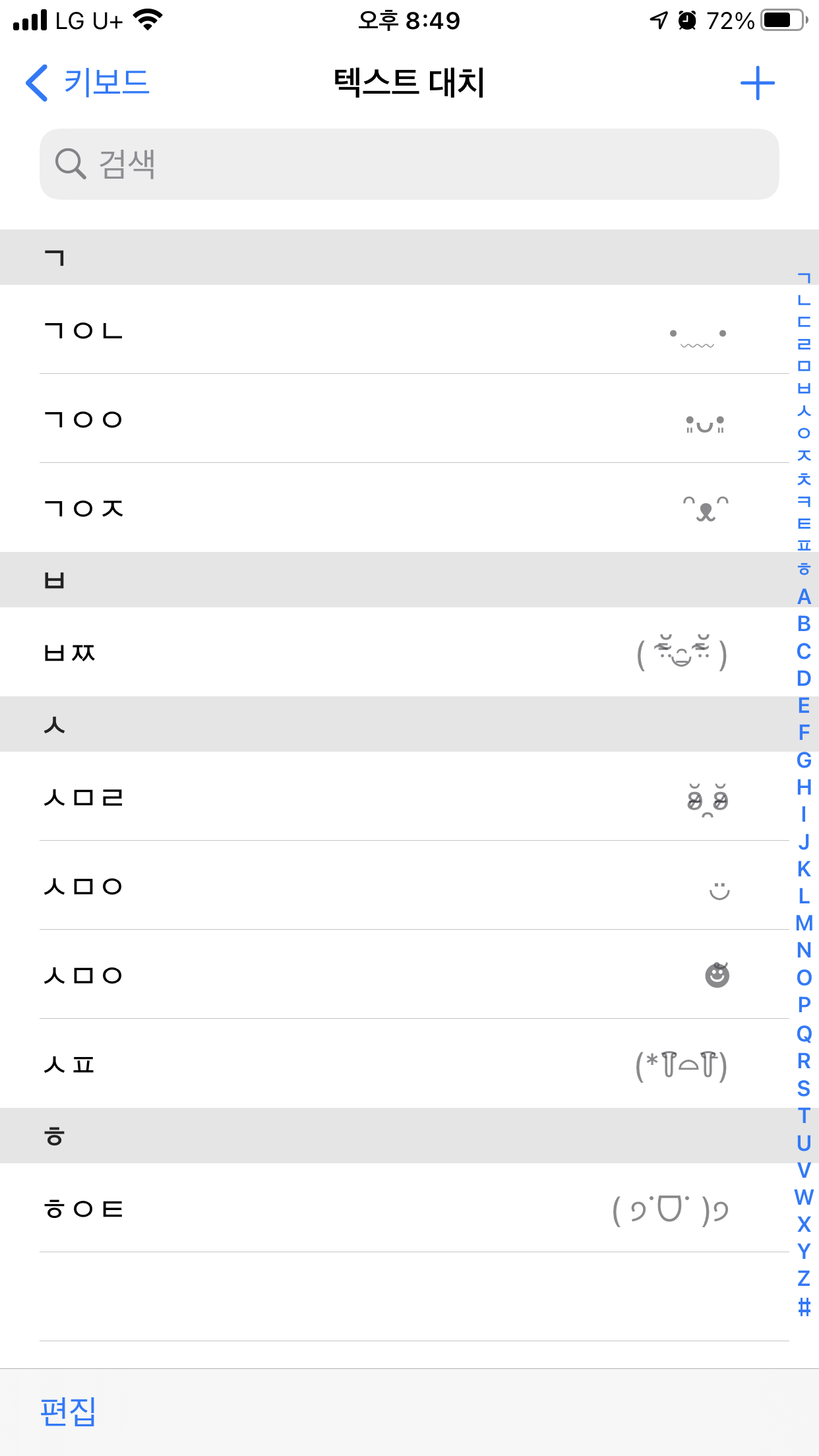 텍스트 대치에 들어가면 위와 같은 화면이 나온다! 나는 기존에 여러 이모티콘을 등록해두었기 때문에 여러개가 보이는데 아마 기존에 등록하지 않았다면 빈 화면이 나올 거다.